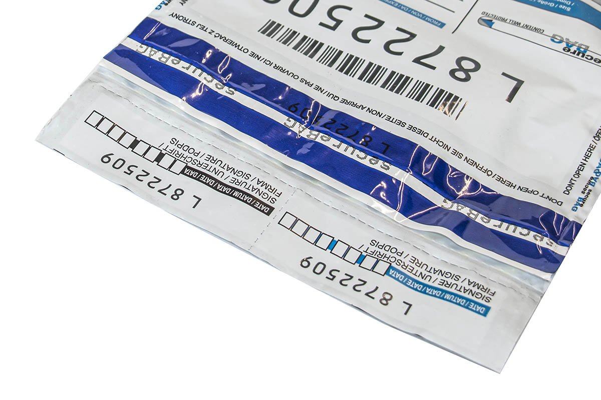 Sobald der Beutel verschlossen/versiegelt ist, ist es unmöglich, ihn unbemerkt zu öffnen und wieder zu schließen. Der Klebestreifen ist mit Sicherheitsband versehen, auf dem nach dem Öffnen eine VOID-Nachricht erscheint. Die anderen Seiten haben doppelte Schweißnähte mit ebenfalls einem Aufdruck.