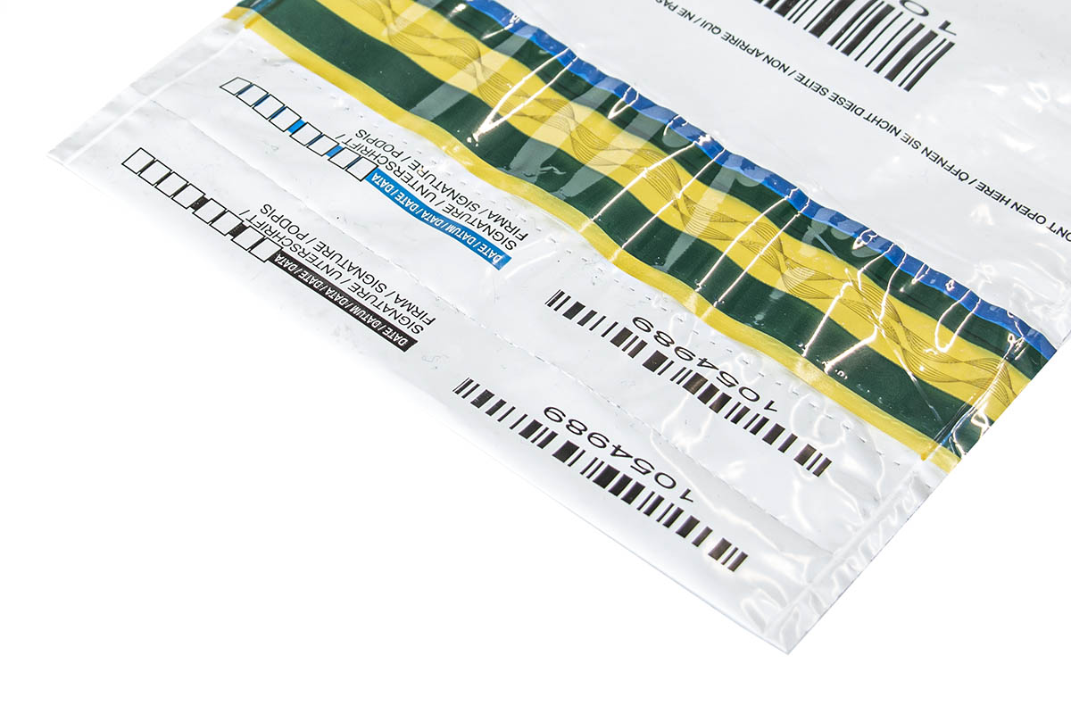 Sobald der Beutel geschlossen/versiegelt ist, ist es unmöglich, ihn ungesehen zu öffnen und wieder zu schließen. Der Klebestreifen ist mit Sicherheitsband versehen, bei dem nach dem Öffnen eine VOID-Botschaft erscheint. Die anderen Seiten sind mit Doppelschweißnähten versehen, bei denen auch ein Druck vorhanden ist.